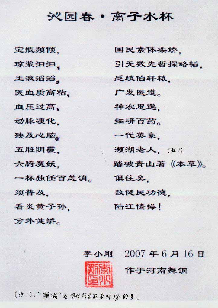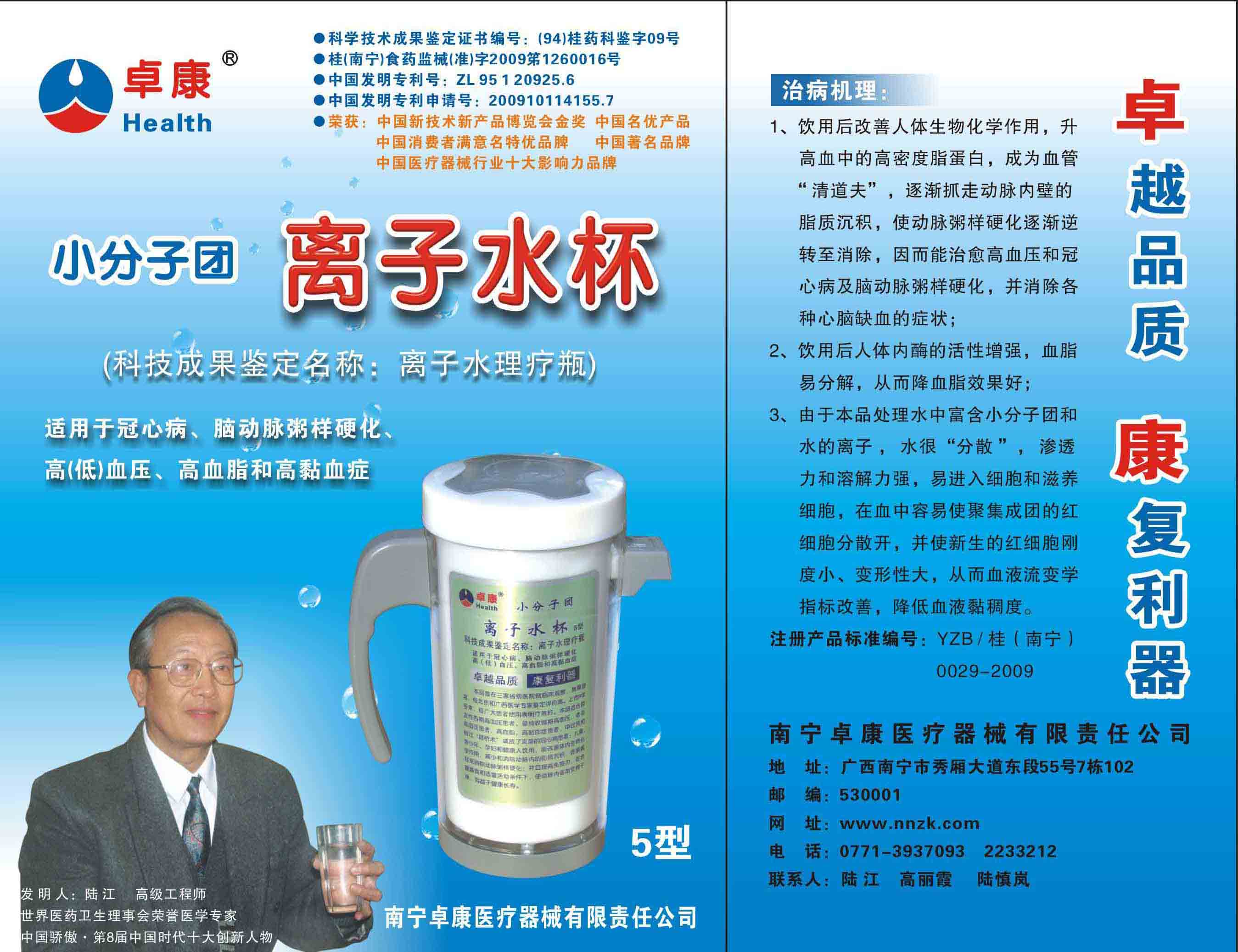 -----我是從事建筑的高工,本來沒有資格去攻克醫(yī)學難題,卻為了自身健康才扣響醫(yī)學的大門。由于我1990年患高血壓,因怕中風才研究發(fā)明了離子水瓶,我把水處理成微小分子團水,飲用后治愈了高血壓。便于1993年底送到三家省級醫(yī)院做臨床試用4個月。經北京和廣西醫(yī)學專家鑒定:"降脂降壓效果好"," 能擴大心腦動脈流量,改善心腦電圖以及微循環(huán)","對治療心腦動脈粥樣硬化、高血壓、高血脂有良好的醫(yī)療保健作用。""產品的技術性能和療效達到了同類產品的國內領先水平,經廣西醫(yī)學科學情報研究所檢索,未見國外有類似報道。"中國醫(yī)學科學院張正國教授從美國國立醫(yī)學圖書館數(shù)據(jù)庫存Medline檢索英俄文資料,均未見類似報告。2000年上市后,我為了對消費者負責而繼續(xù)觀察研究,一直通過《信譽卡》和《質量跟蹤調查書》向患者承諾療效,請用戶使用6個月后反饋效果。和脂壓患者飲用2至5個月內,消除癥狀,停服藥物,血壓正常;冠心病患者飲用3~5個月逐漸減輕至消除心絞痛、房顫等癥狀,不再服藥,飲用1年左右心電圖正常,經冠脈造影掃描無明顯狹窄,表明冠心病痊愈。大量患者還反映許多衰弱器官被修復,讓前列腺增生、慢性咽喉炎、慢性氣管炎、支氣管炎、慢性胃炎、腸炎和膽囊炎等不藥而愈;2型糖尿病患者是因為胰島衰弱致病,飲用該水半年至一年,逐漸減藥至停藥,血糖尿糖正常,真正治愈2型糖尿病。中風后遺癥患者飲用六七個月,可逐漸減輕至消除肢體和語言障礙,表明飲用該水能讓壽命很長的神經元細胞逐漸修復,奇跡般地恢復肢體和語言功能。飲用后還使胸腺和脾臟兩個重要的免疫器官被修復和增強,產生免疫細胞多,提高了免疫力,使人不生病或少生病。自此, 飲用微小分子團水創(chuàng)造了攻克冠心病、高(低)血壓和糖尿病三大醫(yī)學難題的奇跡。人們對此感到不可思議,但實踐是檢驗真理的唯一標準。
