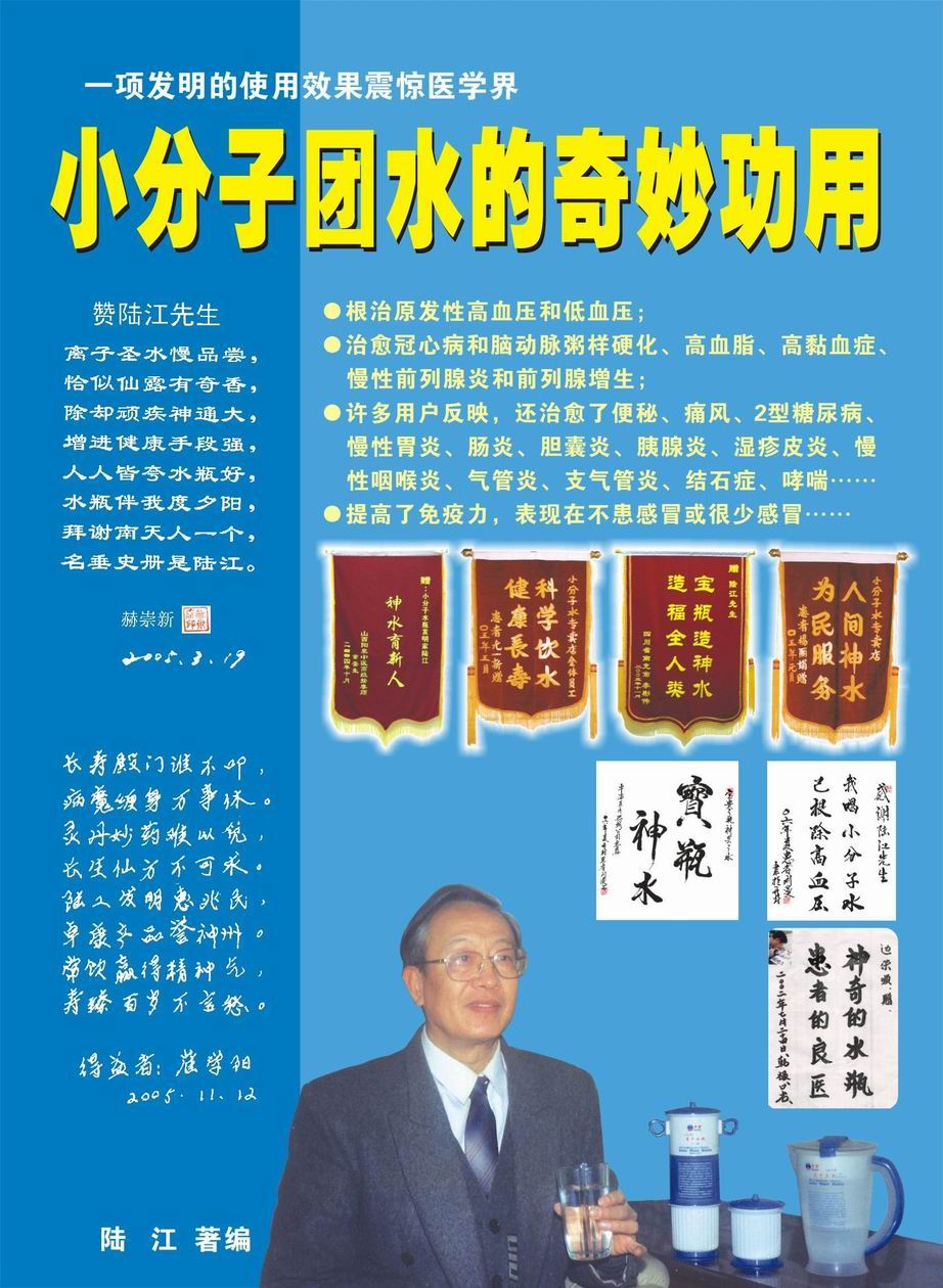 人類幾千年來患以上病癥需終生服藥,幾十年也不能治愈。可是我國南寧的高級工程師陸 江,于1990年想根治高血壓,研究發(fā)明了離子水瓶,處理出微小分子團水供飲用,經過醫(yī)院臨床試用和專家鑒定,1999年獲中國發(fā)明專利權,產品于2000年投放市場后一直跟蹤調查,據(jù)全國各地用戶反饋:祛除了高低血壓、糖尿病和冠心病,并使前列腺增生、咽喉炎、鼻竇炎、慢性氣管炎、支氣管炎、矽肺病、哮喘、慢性胃炎、腸炎、慢性膽囊炎、慢性腎炎、腎衰、膀胱炎、便秘、痔瘡、風濕性關節(jié)炎和濕疹皮炎及中風后遺癥等病癥不藥而愈。為什么喝微小水能治20多種病?陸 江從1991年德國科學家發(fā)現(xiàn)細胞膜水通道僅為2納米獲得啟發(fā),認為多種器官患病是因細胞脫水,不能正常代謝和分裂增殖,才使器官細胞減少致衰弱萎縮而形成細胞缺水性病癥。22年來的實踐有力地支持了“細胞脫水致病”這一重要論點,表明喝微小水可滿足細胞的生理需求,補水就能祛病,是生命科學新亮點。